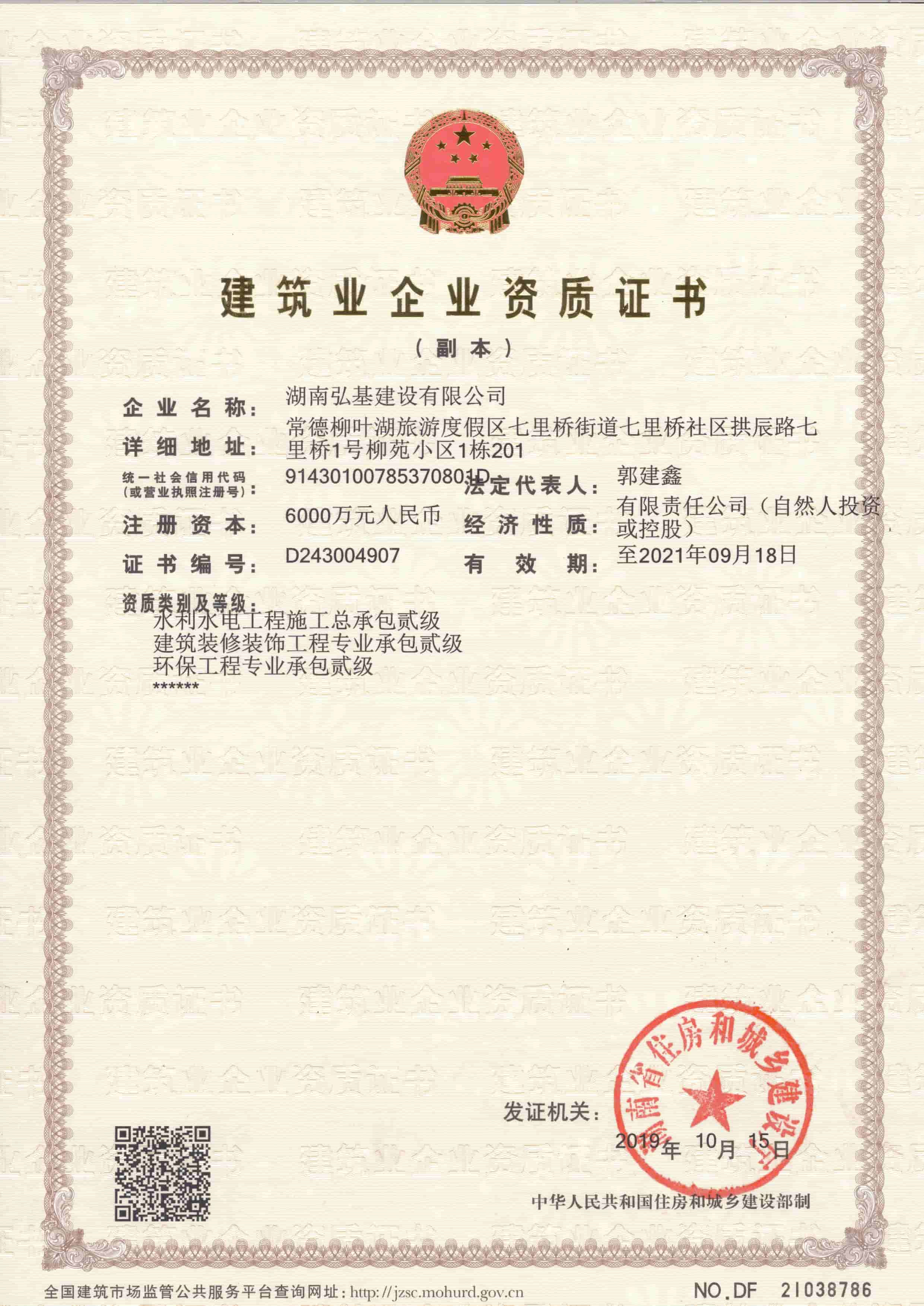 2019年10月17日,湖南省住房和城乡建设厅发布了《关于2019年第十二批建筑业企业资质的通知》的公告。该通知中显示,湖南弘基建设有限公司顺利通过“水利水电工程施工总承包二级”、“环保工程专业承包二级”资质升级审批。我公司已换取相关资质证书。 此项资质晋升工作的顺利完成,使公司的建筑业企业资质得到...